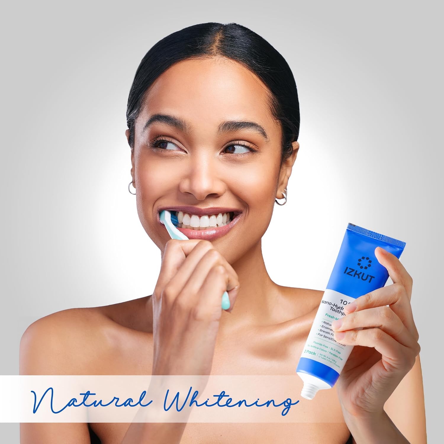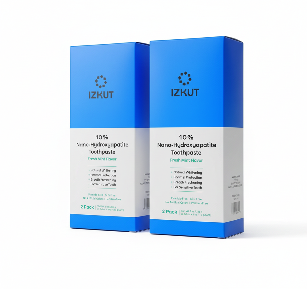 IZKUT nanohydroxyapatite toothpaste helps maintain a naturally brighter smile by supporting enamel smoothness and removing surface stains. It does not use peroxide or harsh abrasives, so the whitening effect is gentle and natural.