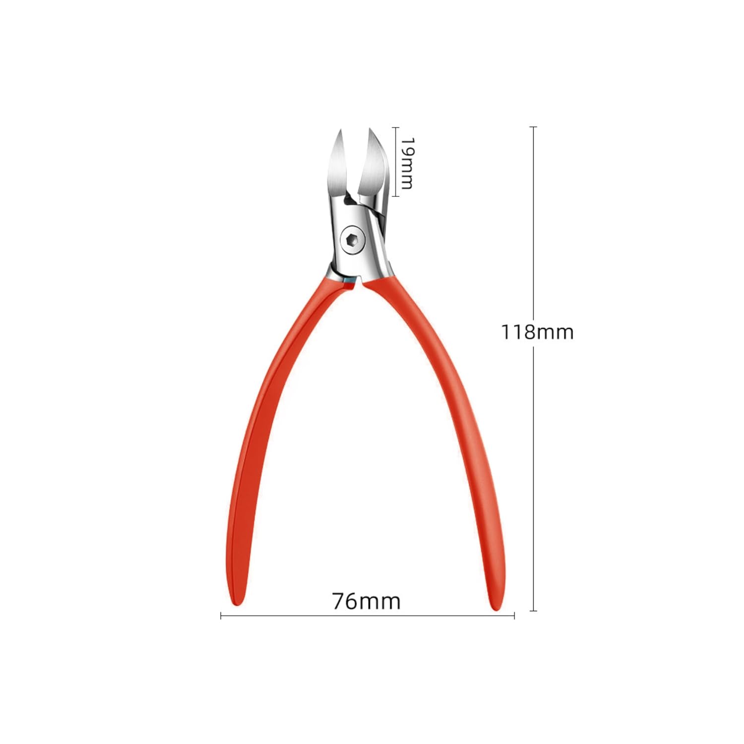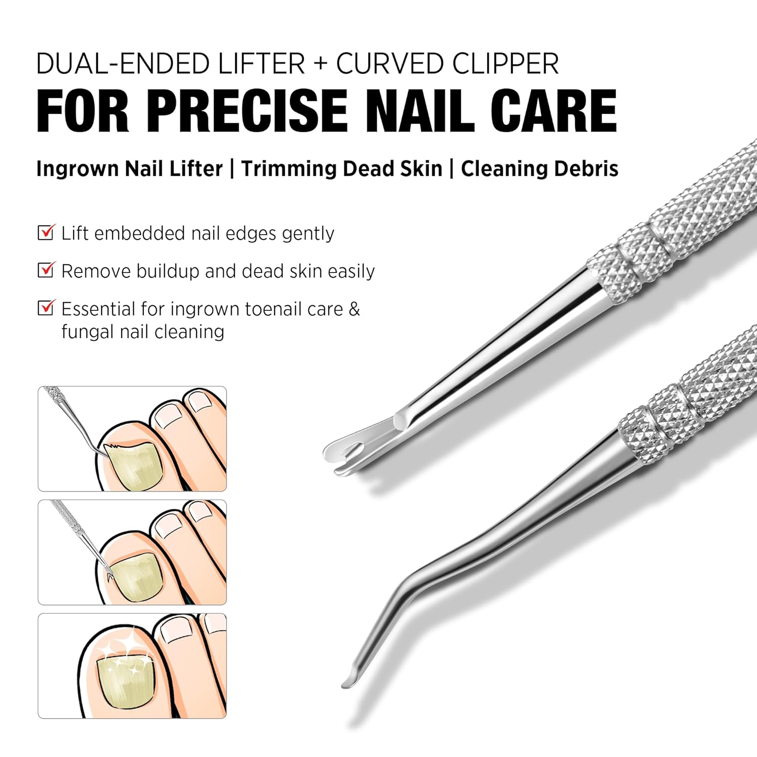 Use the double-ended lifter to gently raise embedded nail edges, then trim cleanly with the sharp, heavy-duty clipper designed to cut through thick or rough nail surfaces without splitting.